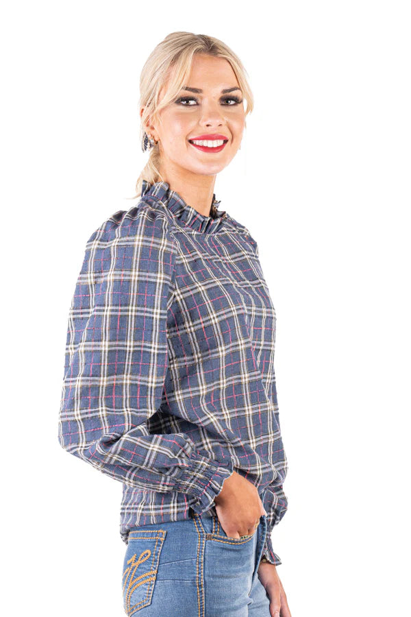 Crafted from a unique navy poly-cotton plaid check featuring a pop of neon pink, this classic shirt exudes timeless elegance. The fabric is a textured seer sucker base. With a roomy design, it can be effortlessly tucked into jeans for a chic look or left out over skinny jeans with flats for a relaxed vibe. The shirred elastic cuff with a frill on a longer sleeve allowance provides versatility, allowing you to wear the sleeves down or scrunched up. The gathered linen frill neckline and gentle puff sleeve add a touch of femininity to the design. **Please note, this top is roomy and generous in cut, ensuring both style and comfort. Models wear XXS.