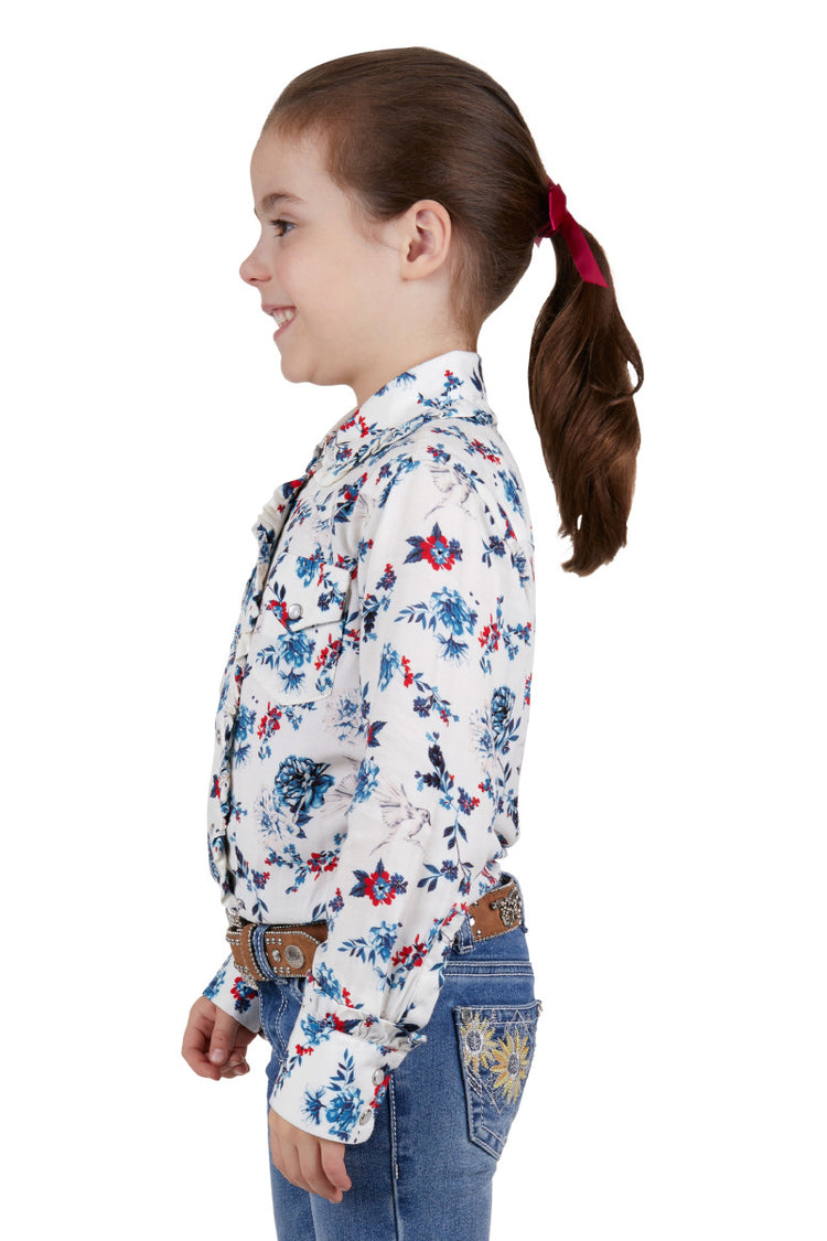 Classic western long sleeve shirt, pearl snap closure, western chest pockets, western front and back yokes, ruffle detail on collar, front placket and sleeve cuffs, Pure Western logo pip on side seam, soft handfeel and drape