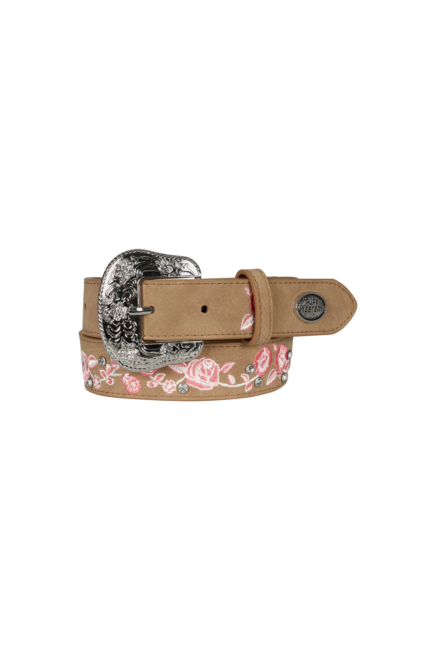 The Pure Western Kid's Andriana Belt showcases intricate floral embroidery paired with sparkling diamanté studs for a stylish touch. It features a removable buckle, a distinctive Pure Western concho, and durable silver hardware, combining functionality with classic Western design.