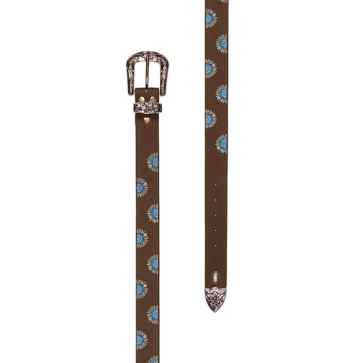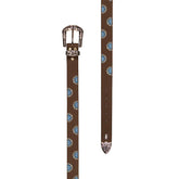 The Pure Western Kiki Belt features intricate embroidery crafted with metallic thread, adding a refined shimmer to its design. It includes a removable buckle and is accented with a signature Pure Western concho and antique bronze hardware, combining durability with classic Western style. This belt offers both versatility and a distinguished look, perfect for elevating your wardrobe with expert craftsmanship.