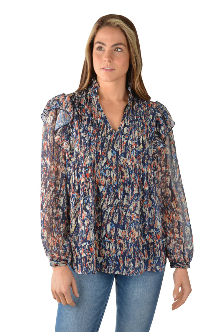 Long sleeve blouse with v-neck and front tie, soft hand feel and drape, ruffle detail on shoulder seam, tuck detail on front chest, fully lined body, thin button cuff at sleeve hem, Pure Western logo pip on side seam