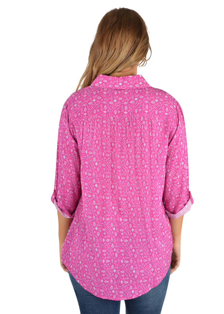 - Features: Half placket button up relaxed shirt, original hand drawn Aztec print, mid weight fabric with soft hand feel and drape, 3/4 sleeve with button tab, gather detail at front and back yoke