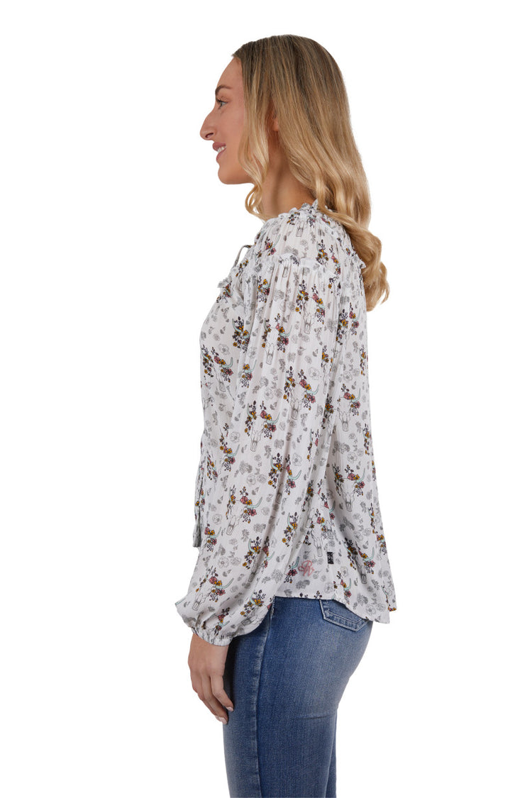 Long sleeve blouse with v-neck and front tie tassel detail, soft handfeel and drape, gathering on front yoke, ruffle detail on front yoke, sleeve panel and collar, center front button up detail with self covered buttons, elasticated sleeve cuffs, Pure Western embroidery on front hem, Pure Western logo pip on side seam