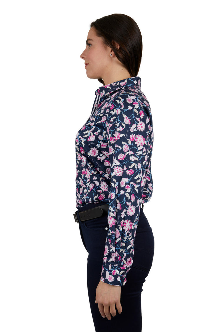 Thomas Cook original hand drawn print, stretch for comfort and movement, velvet taping on inside neck and sleeve cuffs, front and back waist darts, pintuck detail at sleeve cuffs, criss cross embroidery on cuff pintucks, removable collar stays, horseman embroidery on side hem