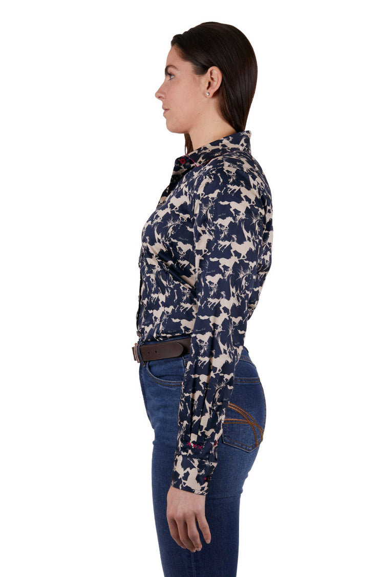 Thomas Cook original hand drawn print, stretch for comfort and movement, velvet taping on inside neck and sleeve cuffs, front and back waist darts, pintuck detail at sleeve cuffs, criss cross embroidery on cuff pintucks, removable collar stays, horseman embroidery on chest