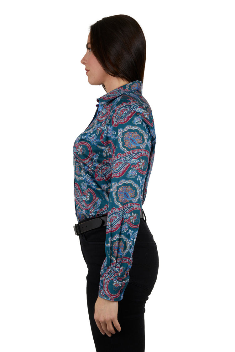 Thomas Cook original hand drawn print, stretch for comfort and movement, velvet taping on inside neck and sleeve cuffs, front and back waist darts, pintuck detail at sleeve cuffs, criss cross embroidery on cuff pintucks, removable collar stays, horseman embroidery on side hem