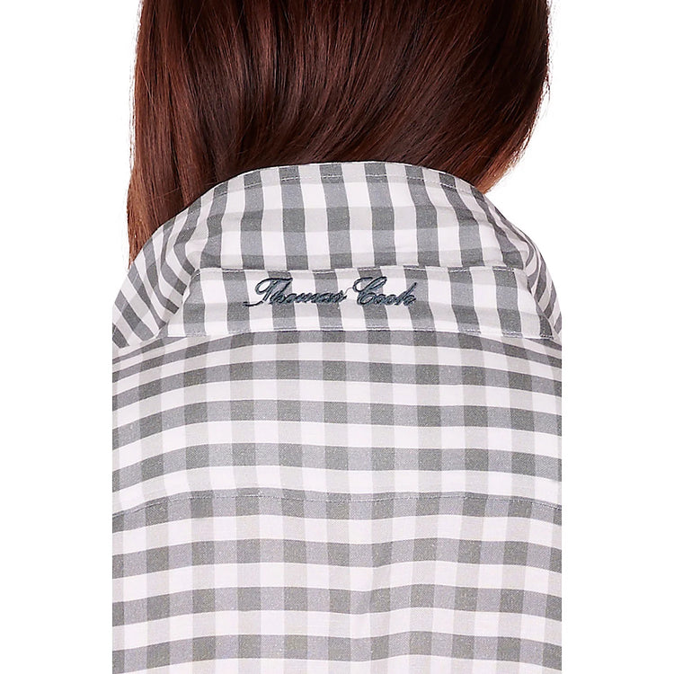 Printed gingham linen blend, breathable linen fabric to keep you cool, printed floral internal trim, grosgrain taping on inside neck and sleeve cuffs, roll up 3/4 sleeves with tabs and buttons to secure, horseman embroidery on side hem