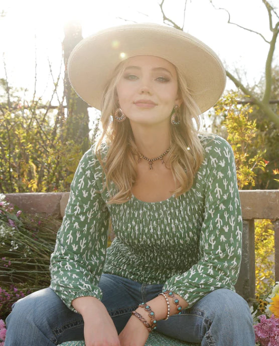 An allover cactus print defines this green smocked top any carefree country gal will want in her wardrobe rotation.