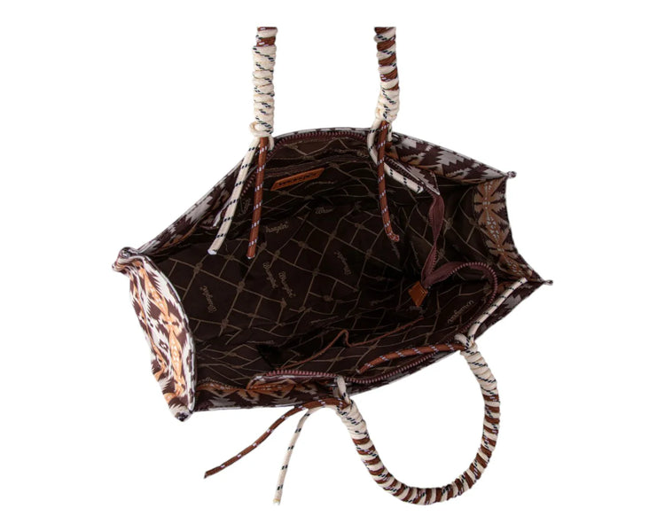 Elevate your style with the Wrangler Coffee Southwestern Oversized Tote, designed for the modern woman who values both fashion and function. Crafted from durable canvas, this spacious tote features a striking Southwestern print complemented by whipstitch detailing and a prominent Wrangler logo patch. The zip top closure ensures your belongings stay secure, while the interior pockets provide easy organisation for all your essentials. Perfect for shopping trips or everyday outings, this tote combines practicality with a bold aesthetic. Discover your new favourite accessory today!