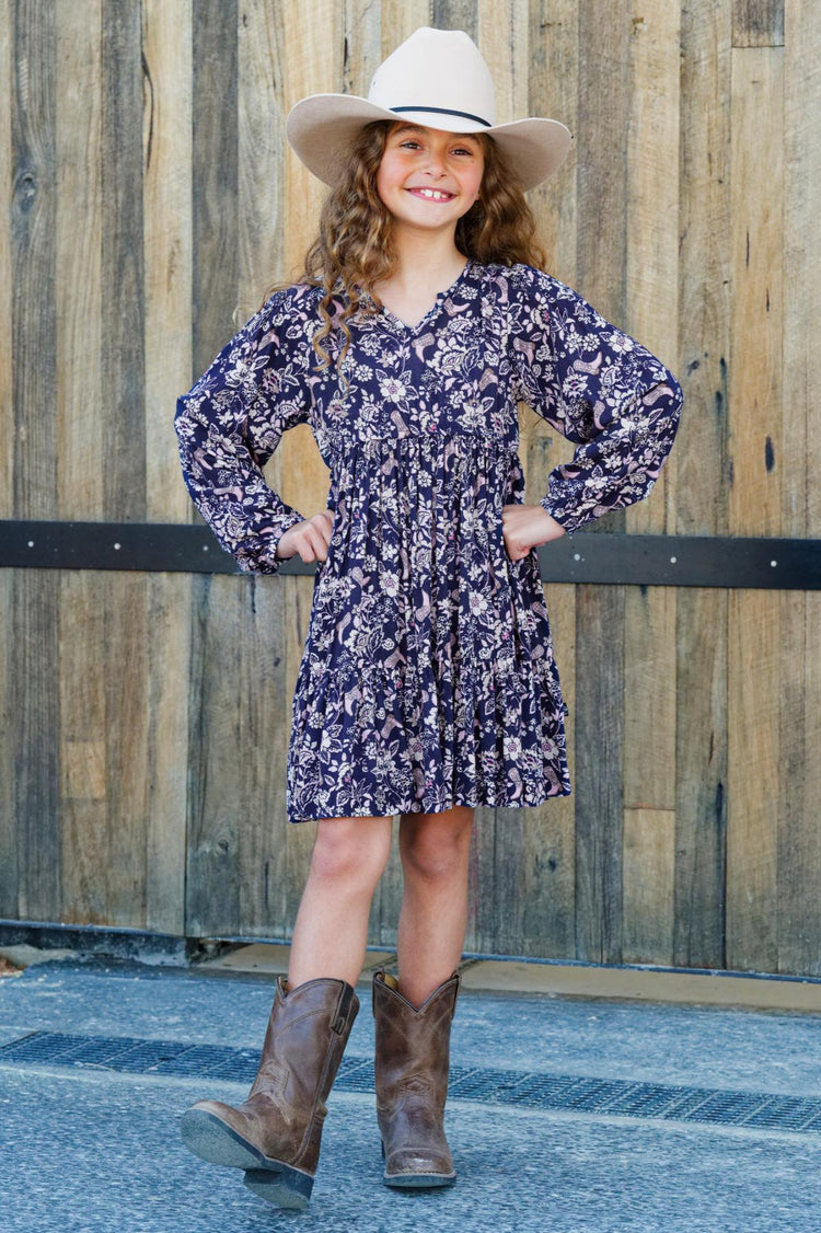 Long sleeve tiered dress with notch neck detail; button closure at back opening; elasticated sleeve cuff; Pure Western logo pip on side seam; soft hand feel and drape