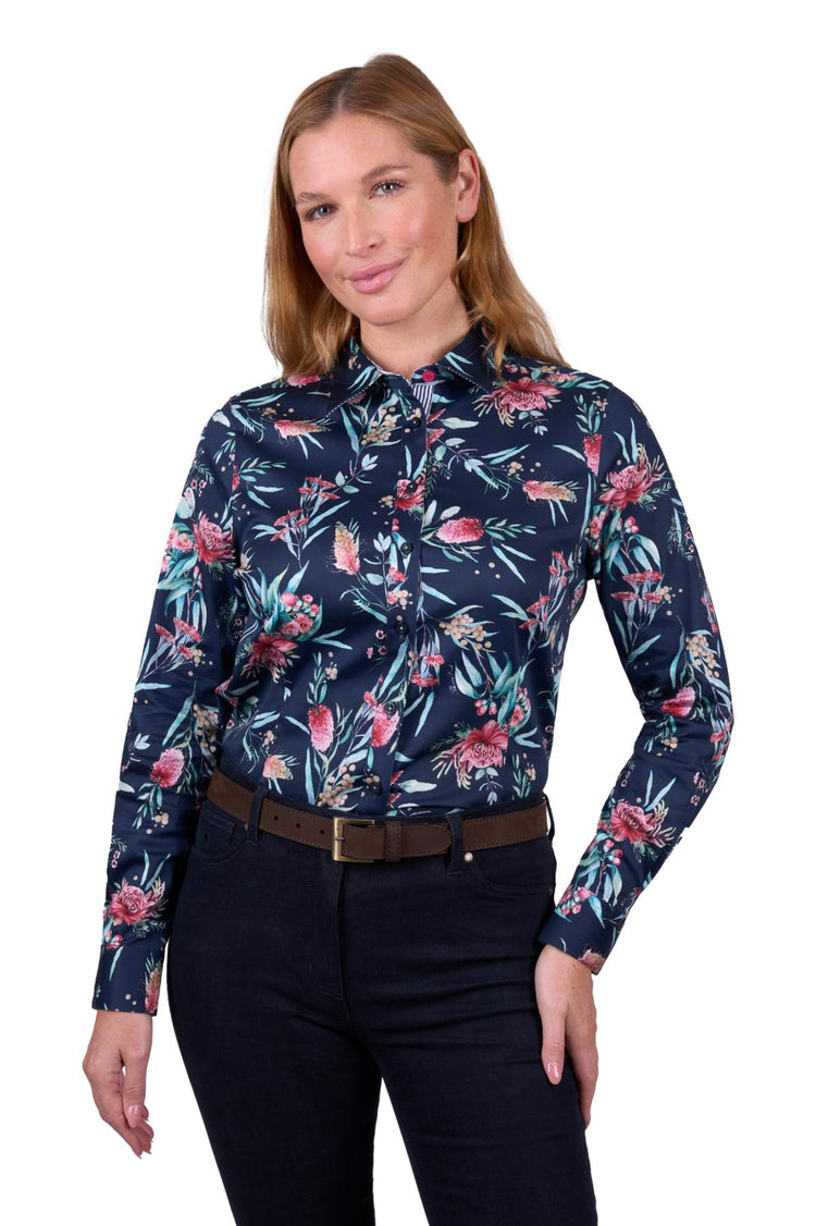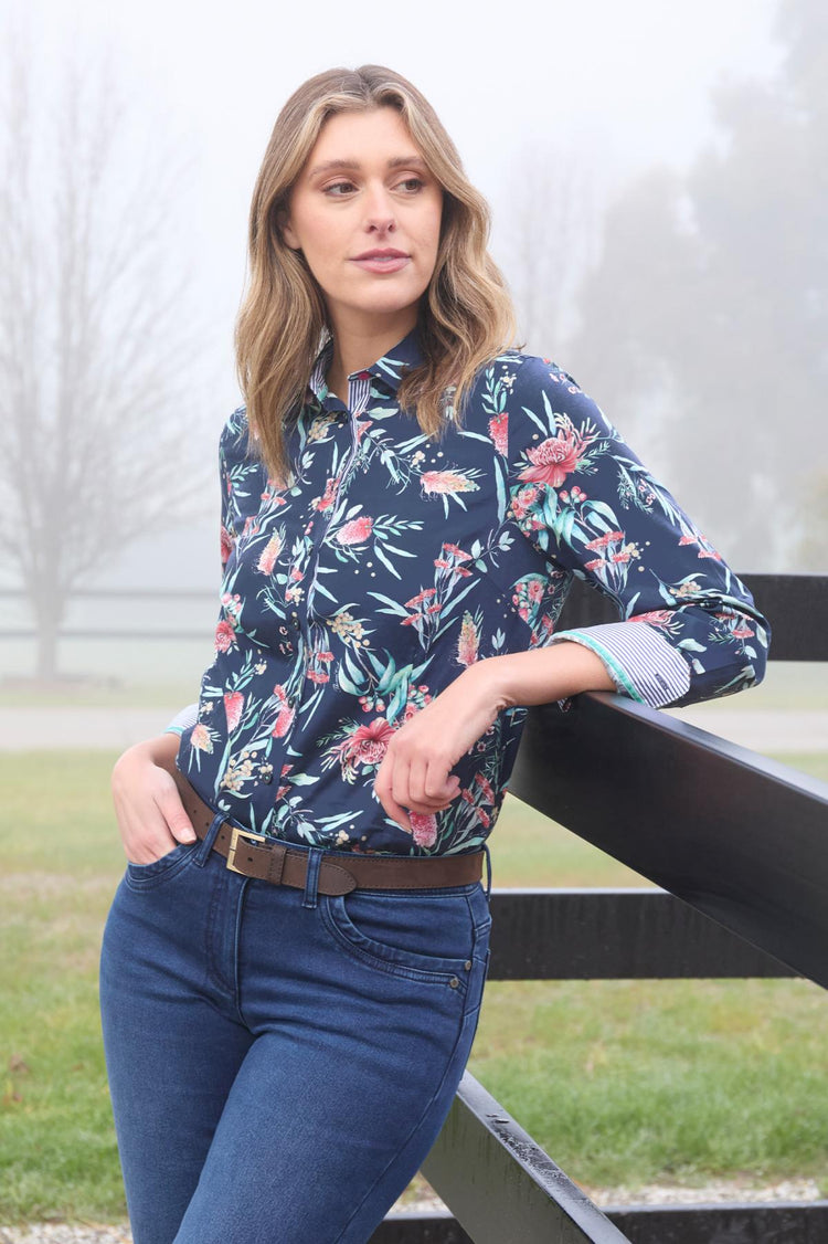 Thomas Cook original hand drawn PRINTS, stretch for comfort and movement, contrast stripe facings inside collar stand and under placket, taping on inside neck, front and back waist darts, pintuck detail at sleeve cuffs, criss cross embroidery on cuff pintucks, horseman embroidery on side hem