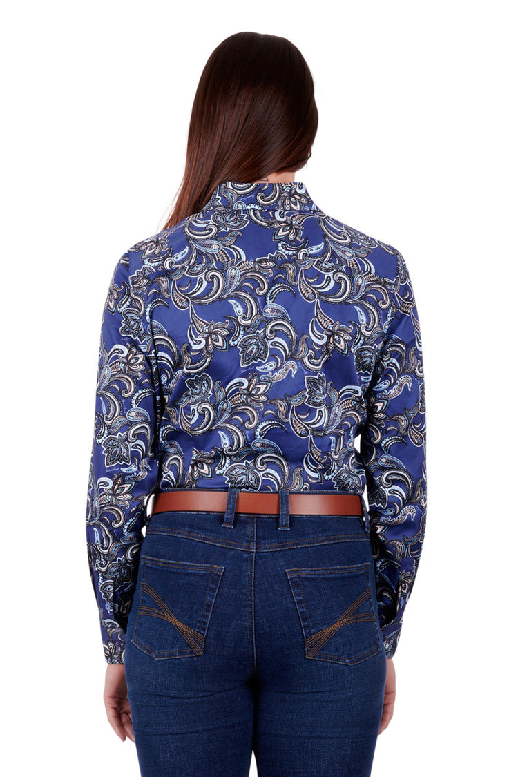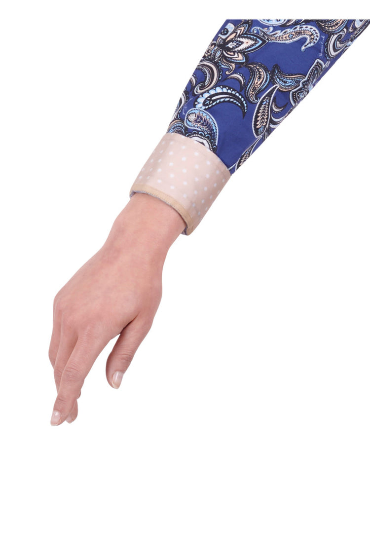Thomas Cook original hand drawn print, stretch for comfort and movement, grosgrain taping on inside neck and sleeve cuffs, front and back waist darts, pintuck detail at sleeve cuffs, criss cross embroidery on cuff pintucks, horseman embroidery on side hem