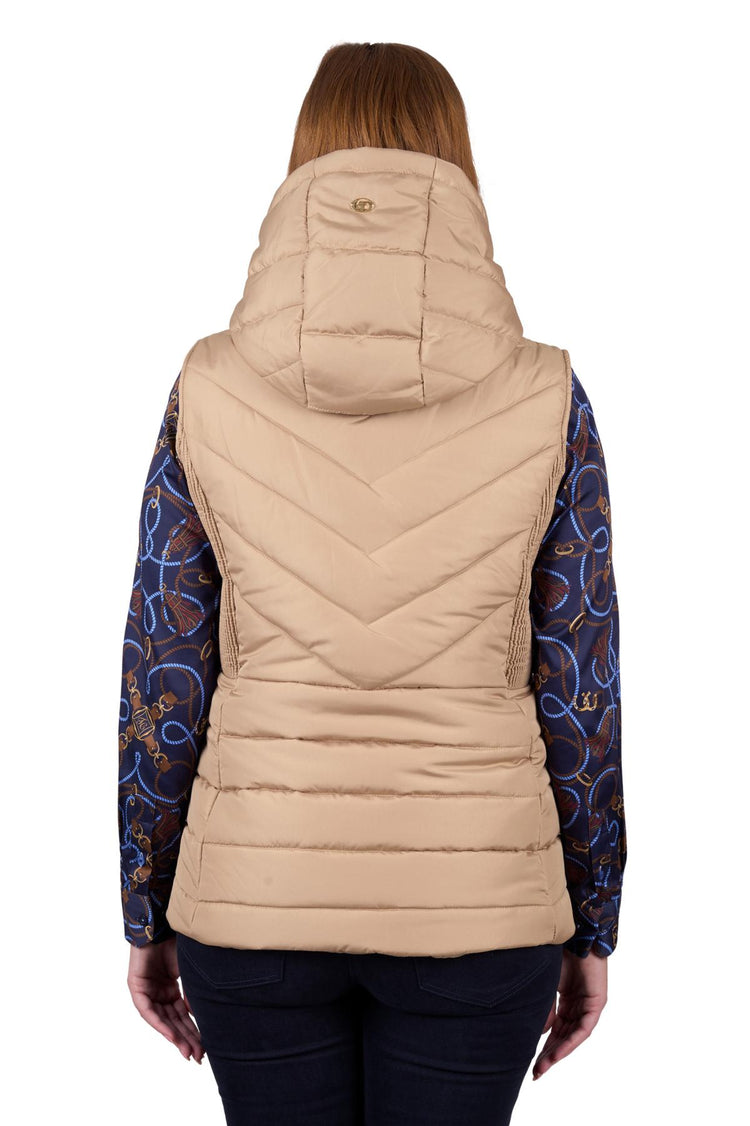 Water repellent fabric, unique quilting design at front and back, Thomas Cook hand drawn digital PRINTSed lining, rust proof metal accessories, premium quality zip closures, detachable hood, front zip pockets, storm flap, quilted waist shaping to flatter the figure, TC internal trims and pockets, horseman embroidery on chest