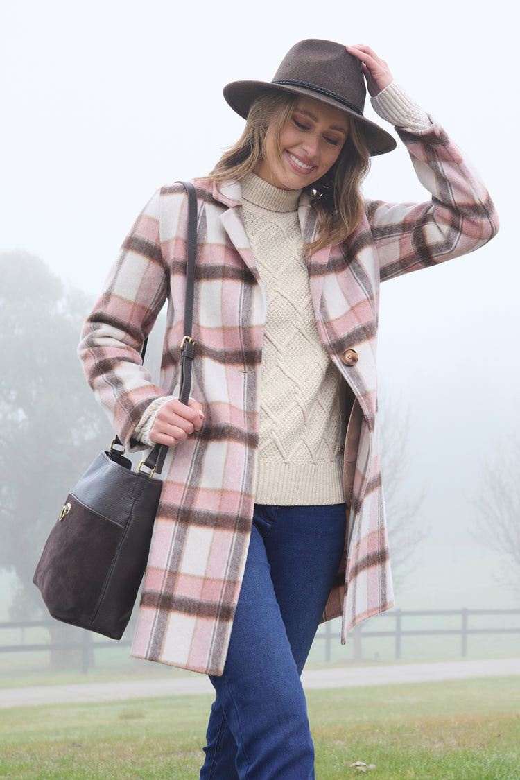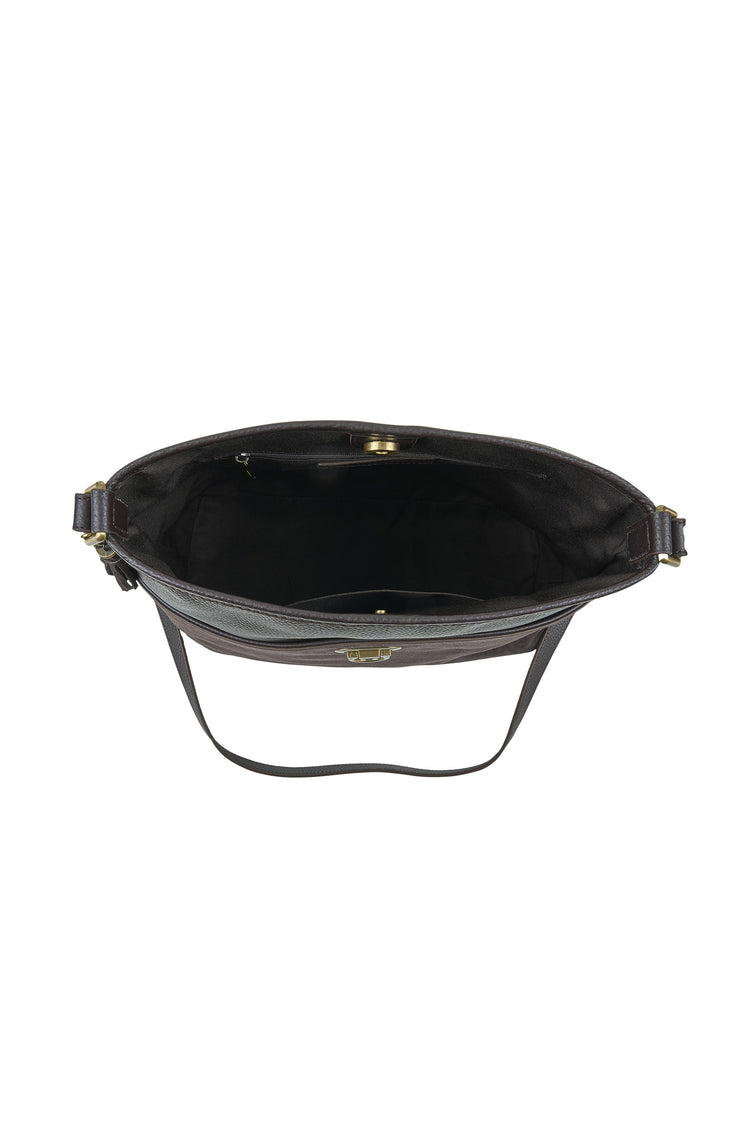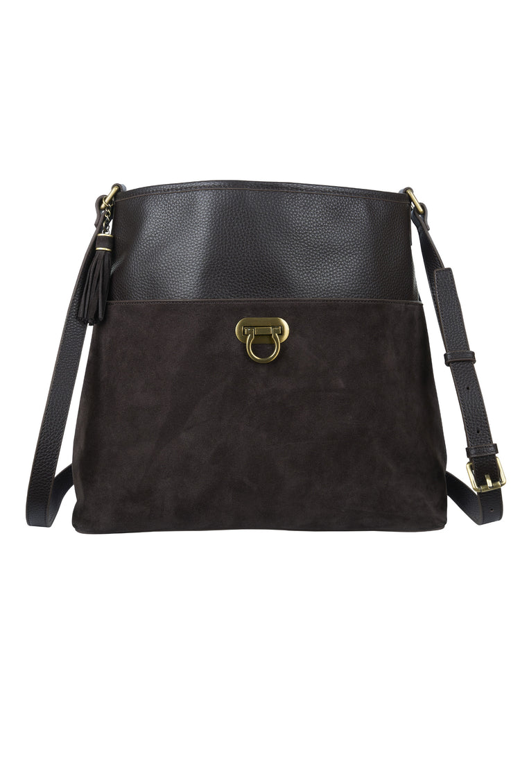 Top magnetic closure, front suede pocket with hardware feature, adjustable long strap, internal zip and slip pockets, suede tassel, logo metal badge, fully lined