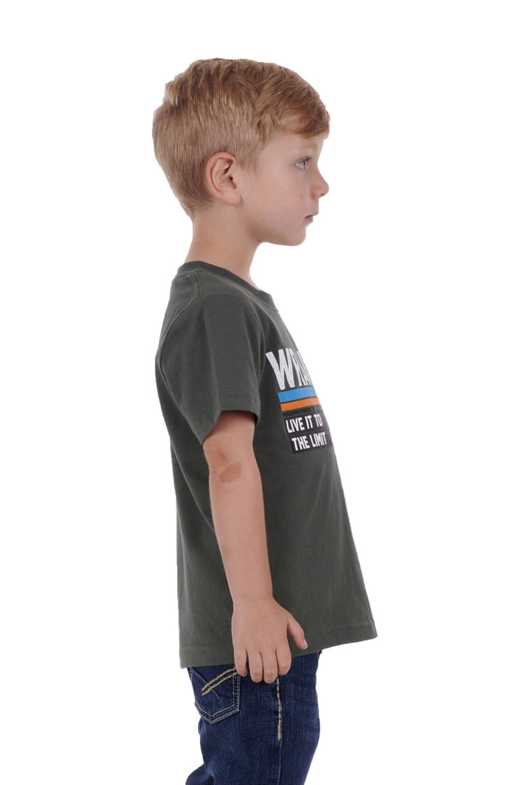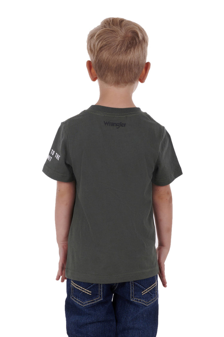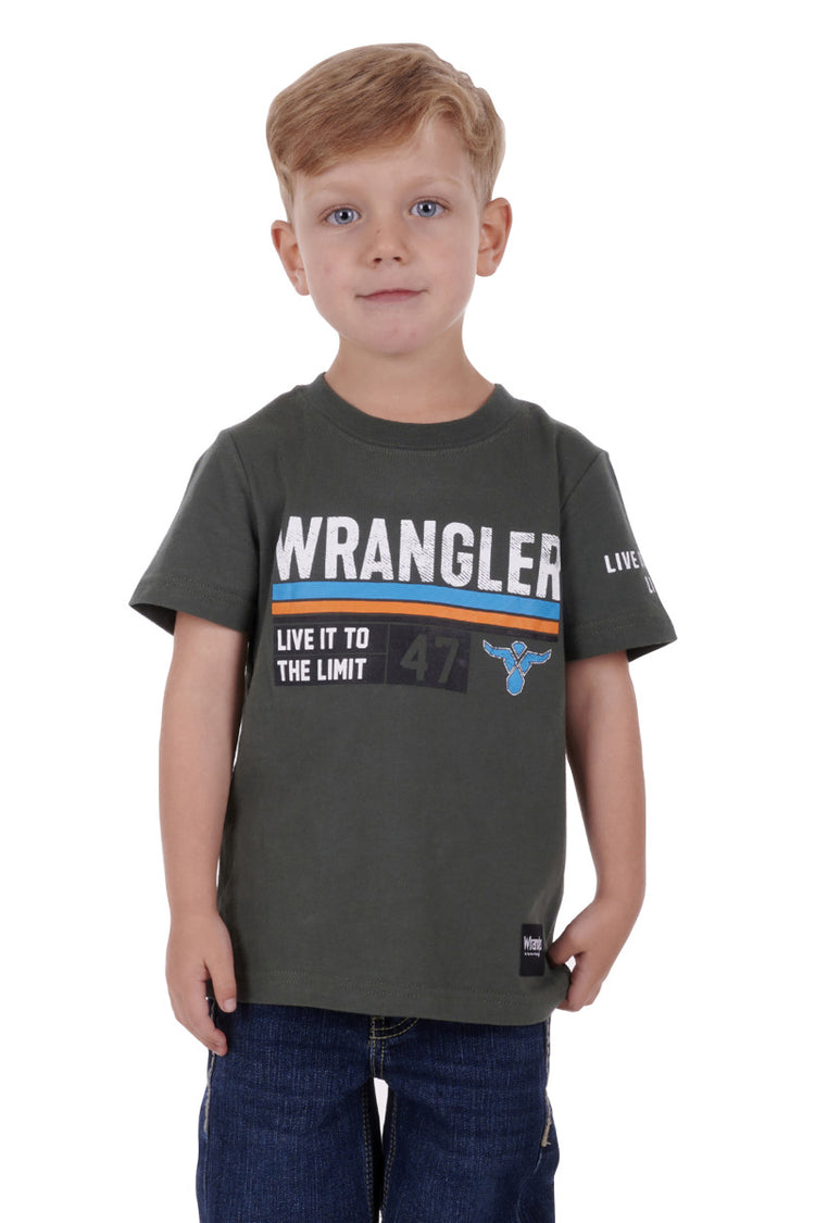Classic short sleeve tee, large front feature Wrangler® print, sleeve print, rib neck band