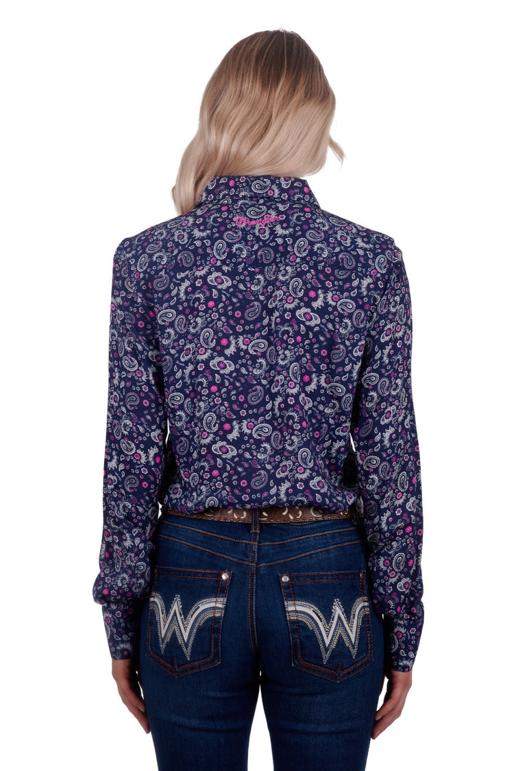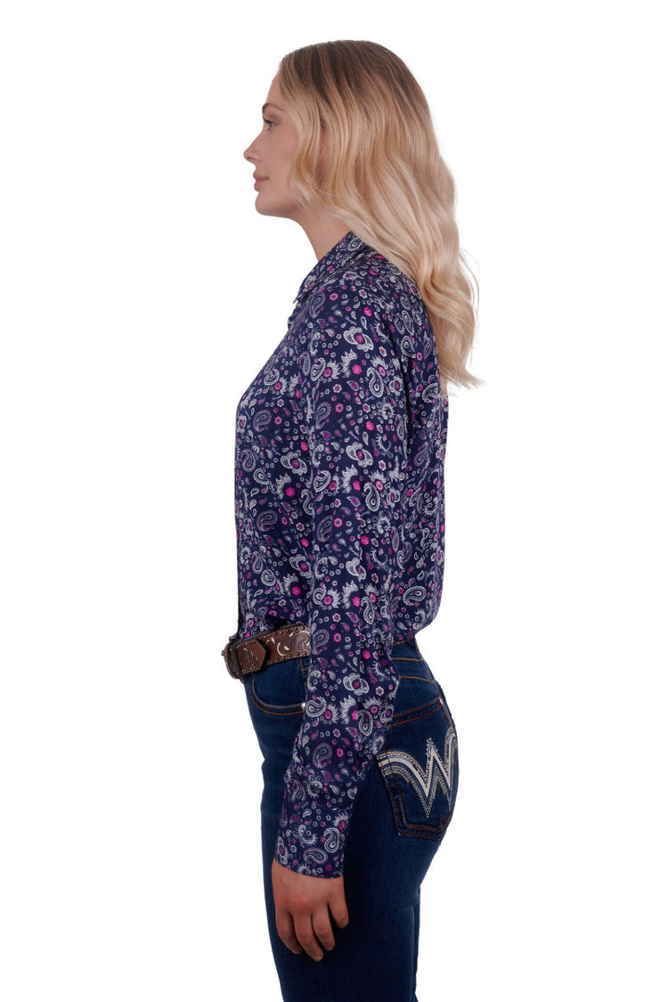 Classic button down long sleeve shirt, button closure, extra button at bust, soft handfeel and drape