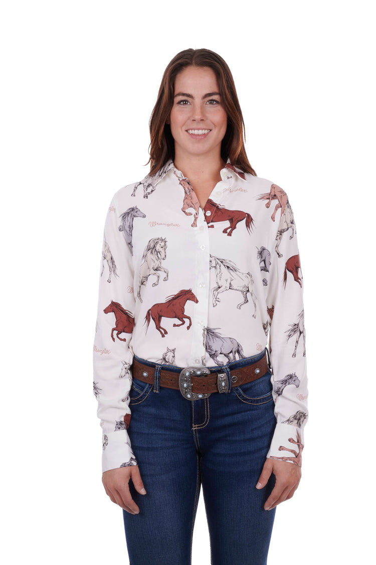 Classic button down shirt, original hand drawn novelty horse print with Wrangler branding, soft handfeel and drape, midweight fabric, button through closure, extra button at bust