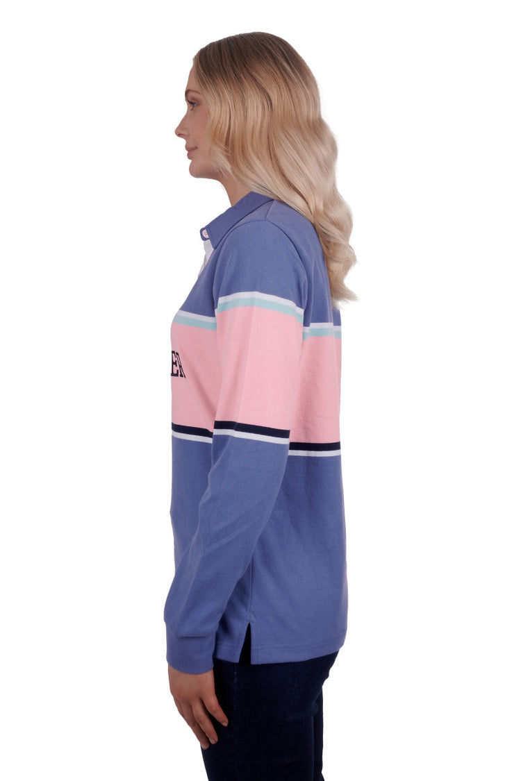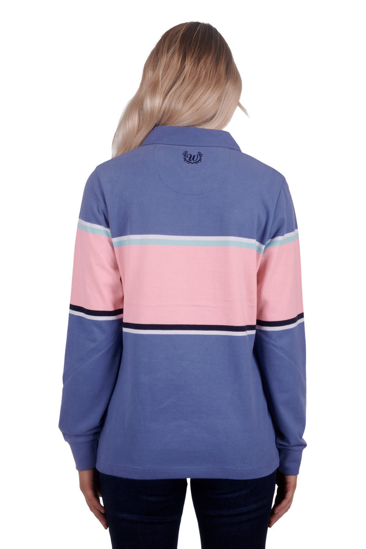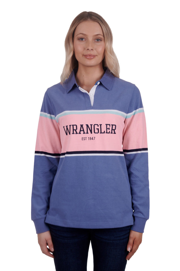 Heavyweight jersey knit rugby, contrast feature panel (on body and sleeves), concealed buttons on centre front placket, cotton drill collar, Wrangler® iconic logo herringbone tape (on back neck and inside side seam splits), rib trim cuffs
