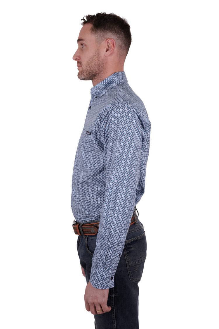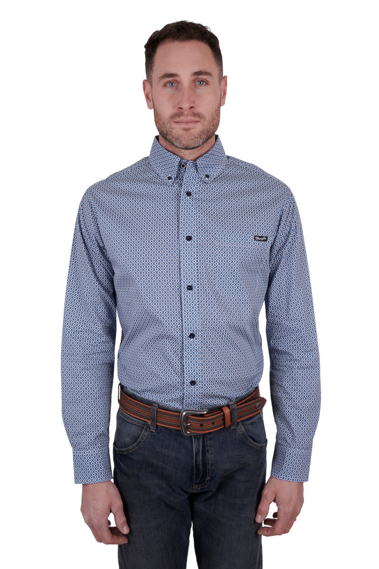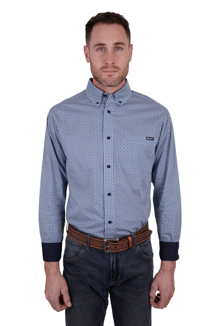 Classic button down long sleeve shirt, button closure, back yoke with box pleat for comfort and movement, single chest pocket, button down collar, contrast trim on inside collar stand