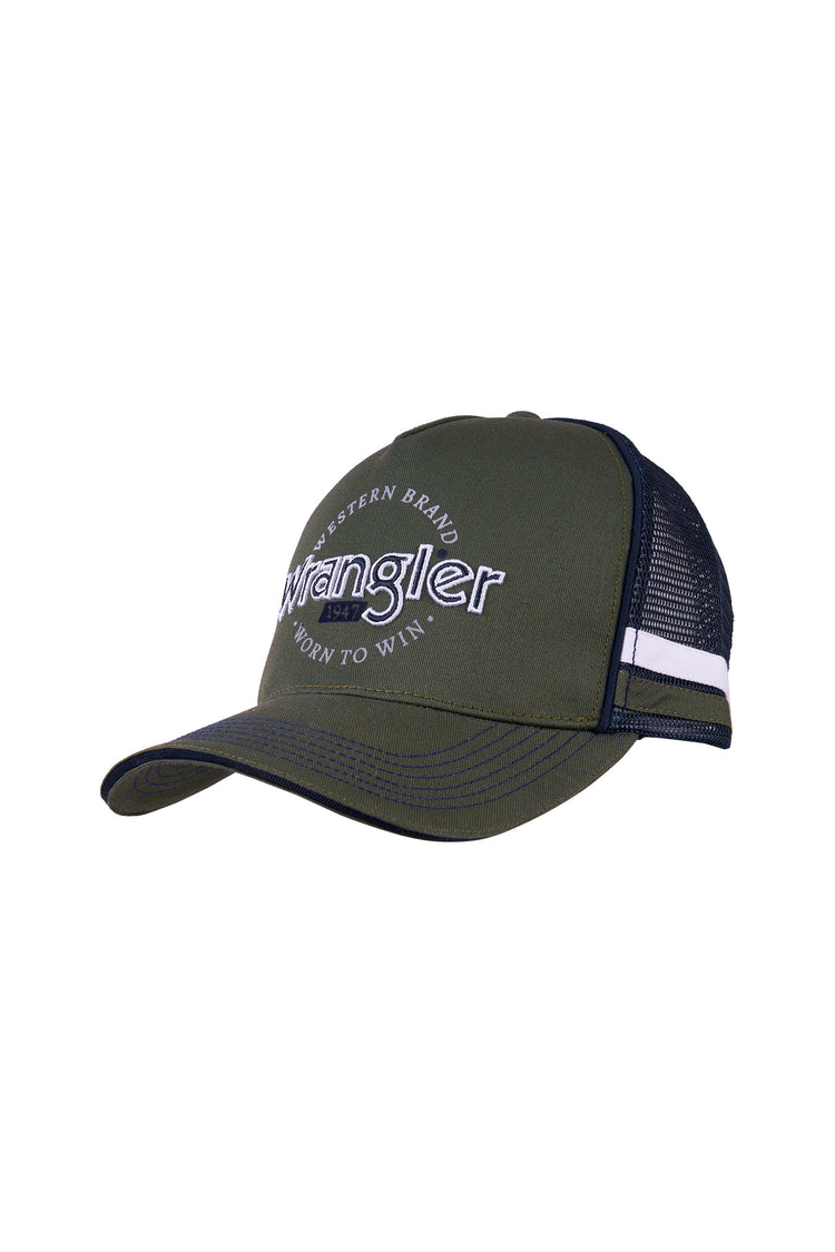 High profile 5 panel trucker cap, peak with contrast top stitching, contrast sandwich peak, side panel taping, contrast crown piping
