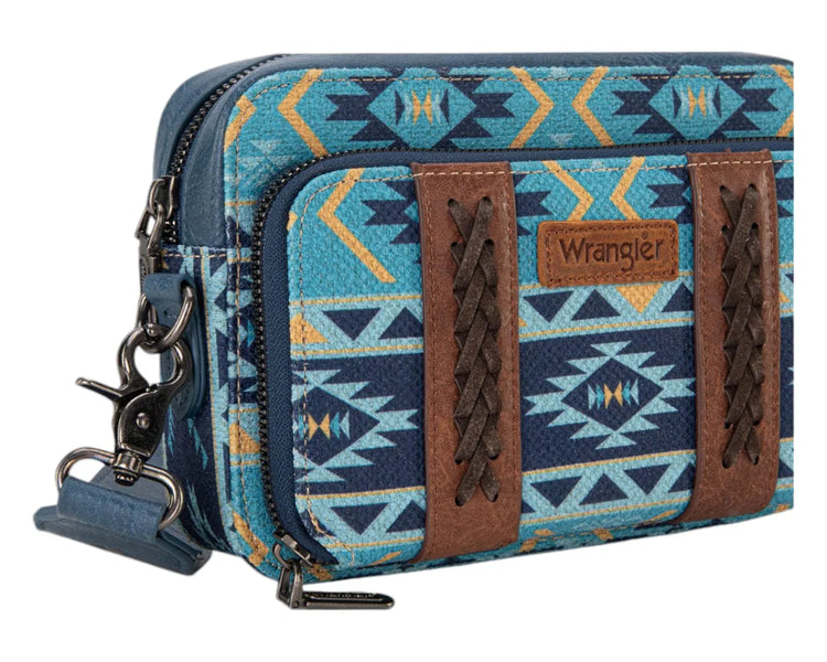 Discover the perfect blend of style and practicality with the Wrangler Aztec Crossbody Wallet. This compact bag features a vibrant Aztec pattern on durable canvas, accented with whipstitch details and rhinestone conchos. The dual zippered compartments and multiple pockets keep your essentials organised, while the detachable strap offers versatile carrying options. Ideal for the fashion-forward woman on the go, this bag seamlessly transitions from day to night. Explore the perfect accessory for your boho-inspired wardrobe today!